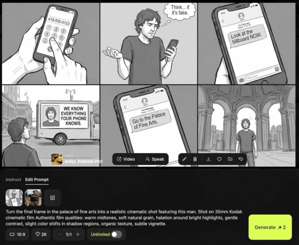 Instead of one hero visual per prompt, Nano Banana Pro can produce a sequence or set of images from a single, carefully written instruction: a story told across multiple frames, in one consistent style.